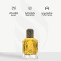 At the heart, a bouquet of floral sophistication blooms — velvety rose, radiant jasmine sambac, delicate freesia, and cyclamen intertwine with orange blossom for a beautifully diffusive, soft yet confident presence. As it settles, the fragrance finds its grounding in the warmth of musk and ambroxan, layered with earthy patchouli and the smoky depth of Hindi oud for a long-lasting, elegant trail.