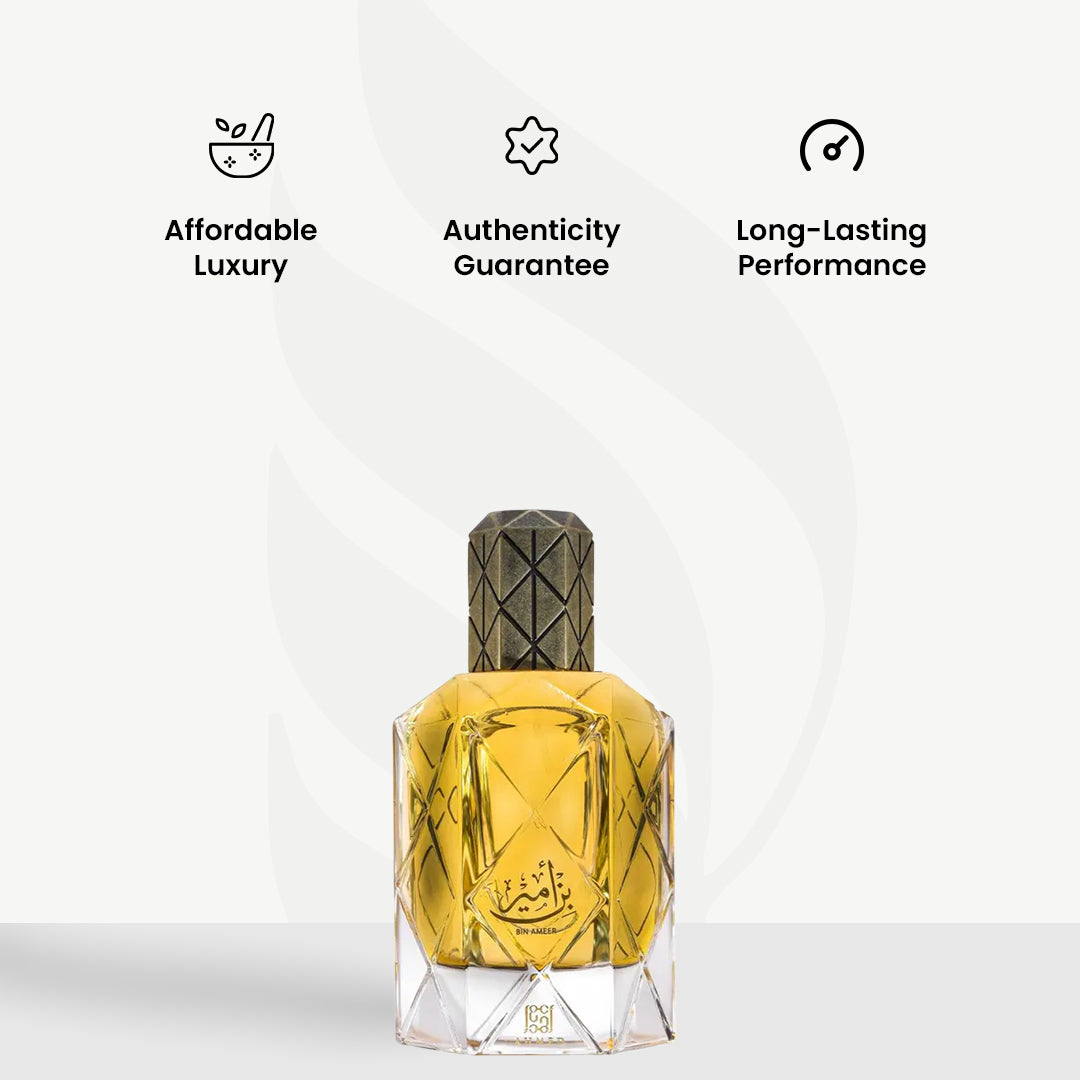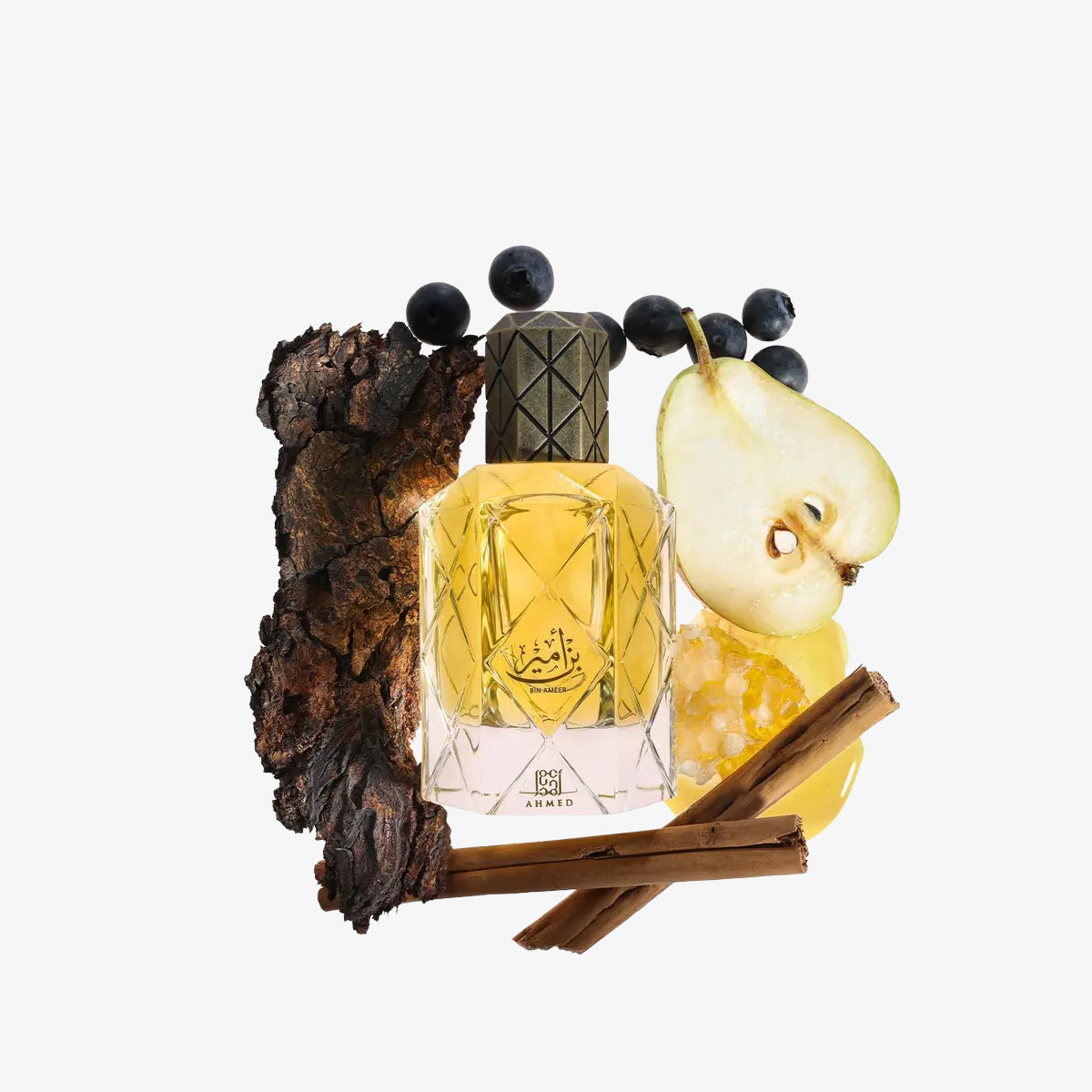 Bin Ameer by Ahmed Al Maghribi is a lavish blend that captures opulence in every layer — a sweet, vibrant introduction evolves into regal florals and finishes in majestic depth. It opens with the lush richness of black currant syrup and ripe pear, wrapped in the golden sweetness of honey and accented by a whisper of cinnamon and citrusy orange.
