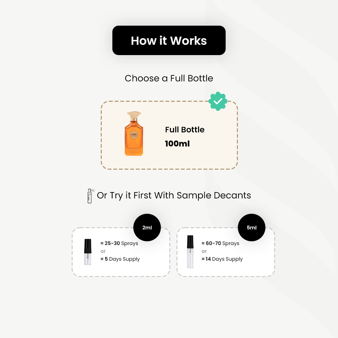 As fragrance lovers we know that we want to get the most out of each sample, starting from the 2ml samples which will give you on average ~5 Wears, 5ml ~12 Wears and 10ml ~24 Wears, those numbers are taking into account around 5 sprays per wear.