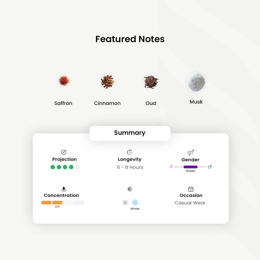 As it unfolds, a symphony of sensual florals takes center stage: lush roses and delicate orange blossom entwine with warm cinnamon and the powdery elegance of orris, creating an aura that feels both regal and romantic. The base anchors the composition with creamy vanilla, soft musk, and a whisper of rich agarwood—deep, smooth, and undeniably opulent.