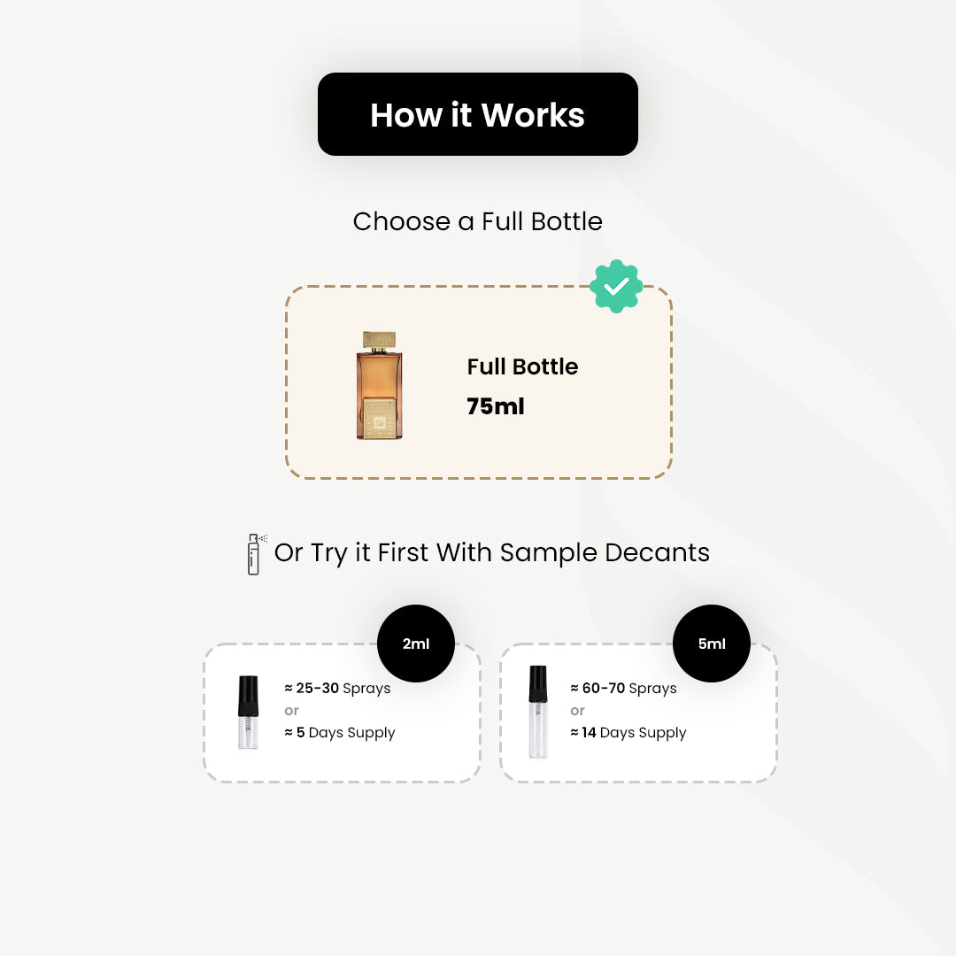 We only offer 100% authentic fragrances provided to us by our trusted distributor directly from Dubai. We never carry fakes, knock-offs, or imitations, and we take this extremely seriously. Each and every bottle is inspected and tested before we start decanting.