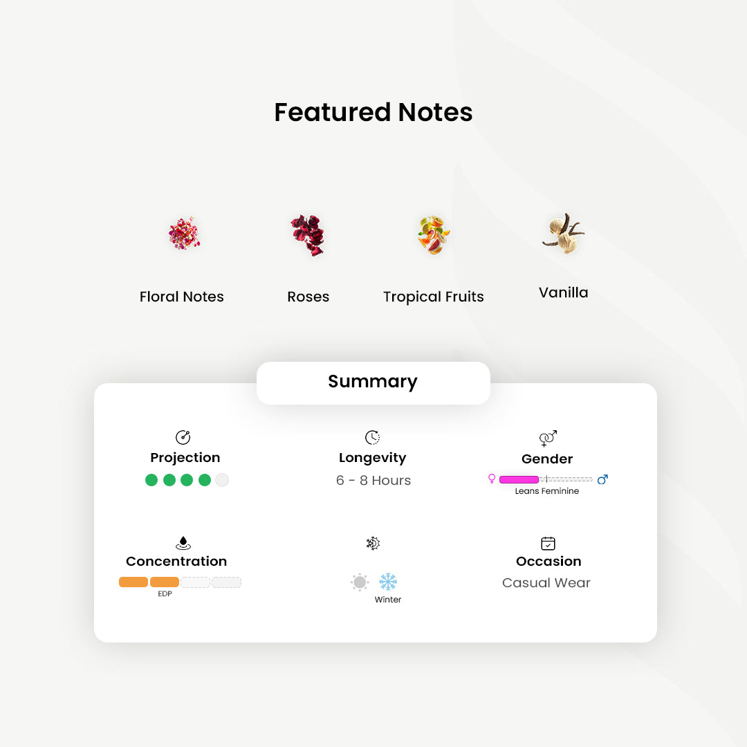 In the heart, a lush blend of tropical fruits meets the classic romance of rose, giving the scent a vibrant, sun-kissed sensuality that feels both playful and refined. The dry-down settles into a creamy base of vanilla, sandalwood, and soft musk, wrapping the wearer in a comforting, skin-hugging warmth that lingers like a memory.
