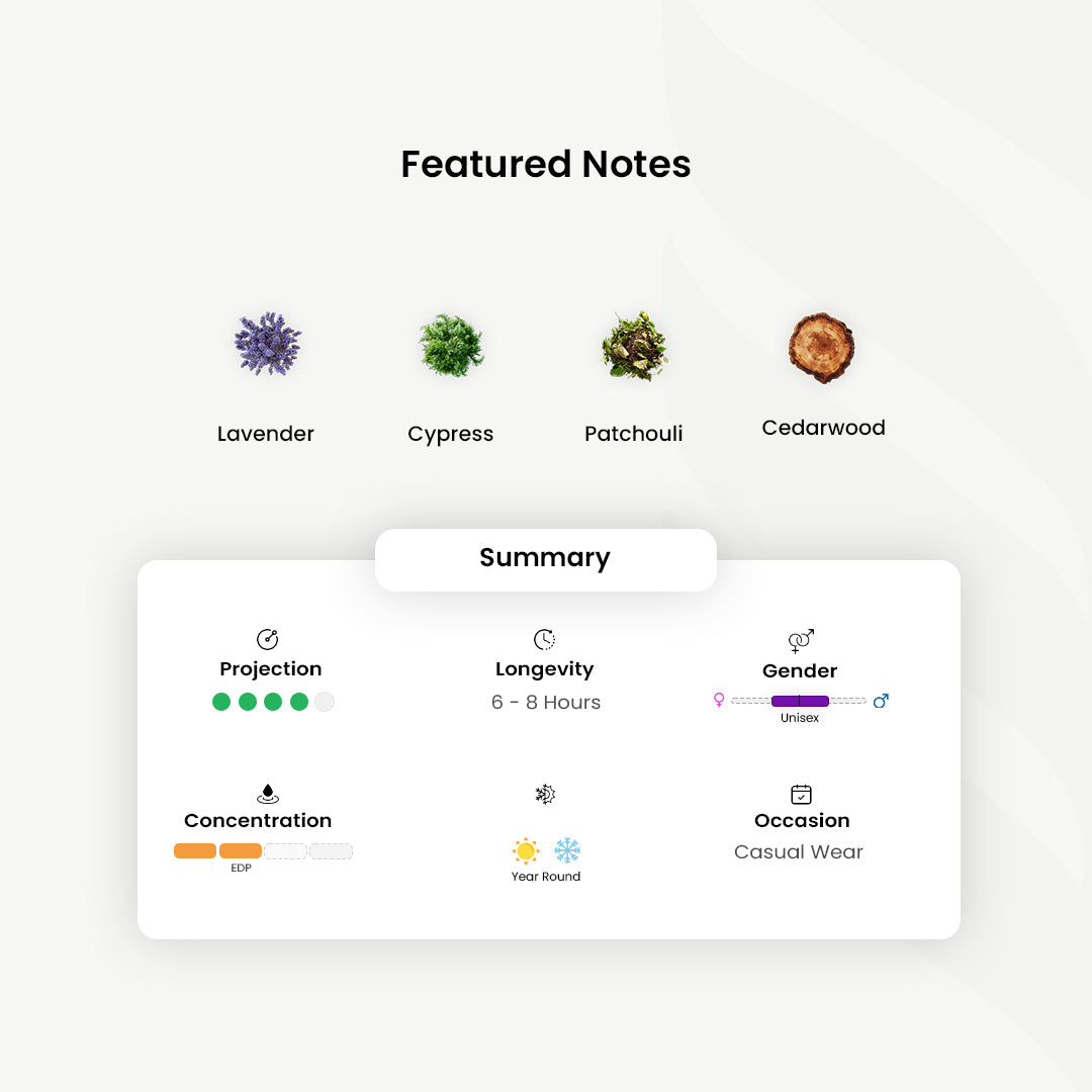 As the scent evolves, the heart pulses with the green sharpness of cypress and the earthy strength of vetiver, adding a refined yet rugged edge. The dry down is a grounding blend of patchouli and cedarwood, delivering a masculine base that is deep, smoky, and magnetic.