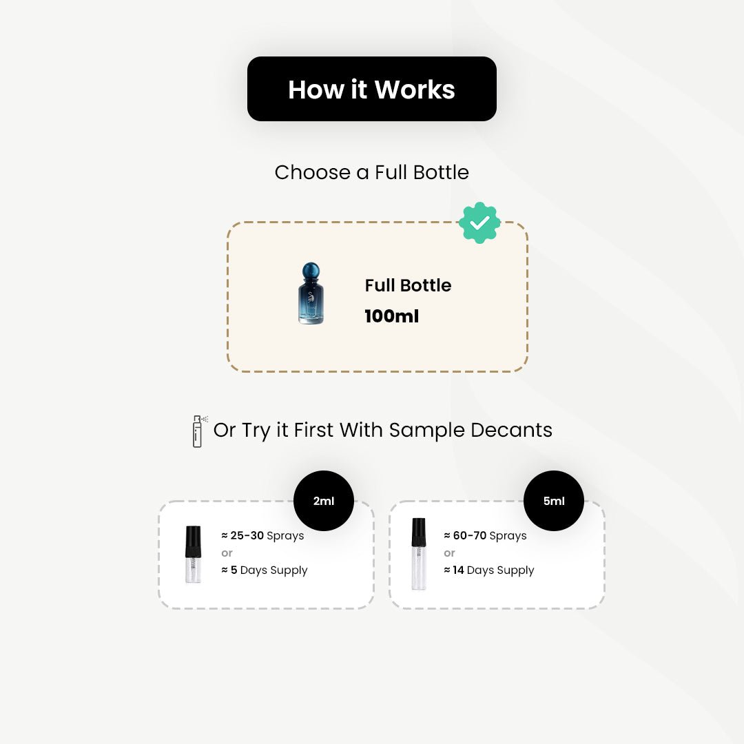 We only offer 100% authentic fragrances provided to us by our trusted distributor directly from Dubai. We never carry fakes, knock-offs, or imitations, and we take this extremely seriously. Each and every bottle is inspected and tested before we start decanting.