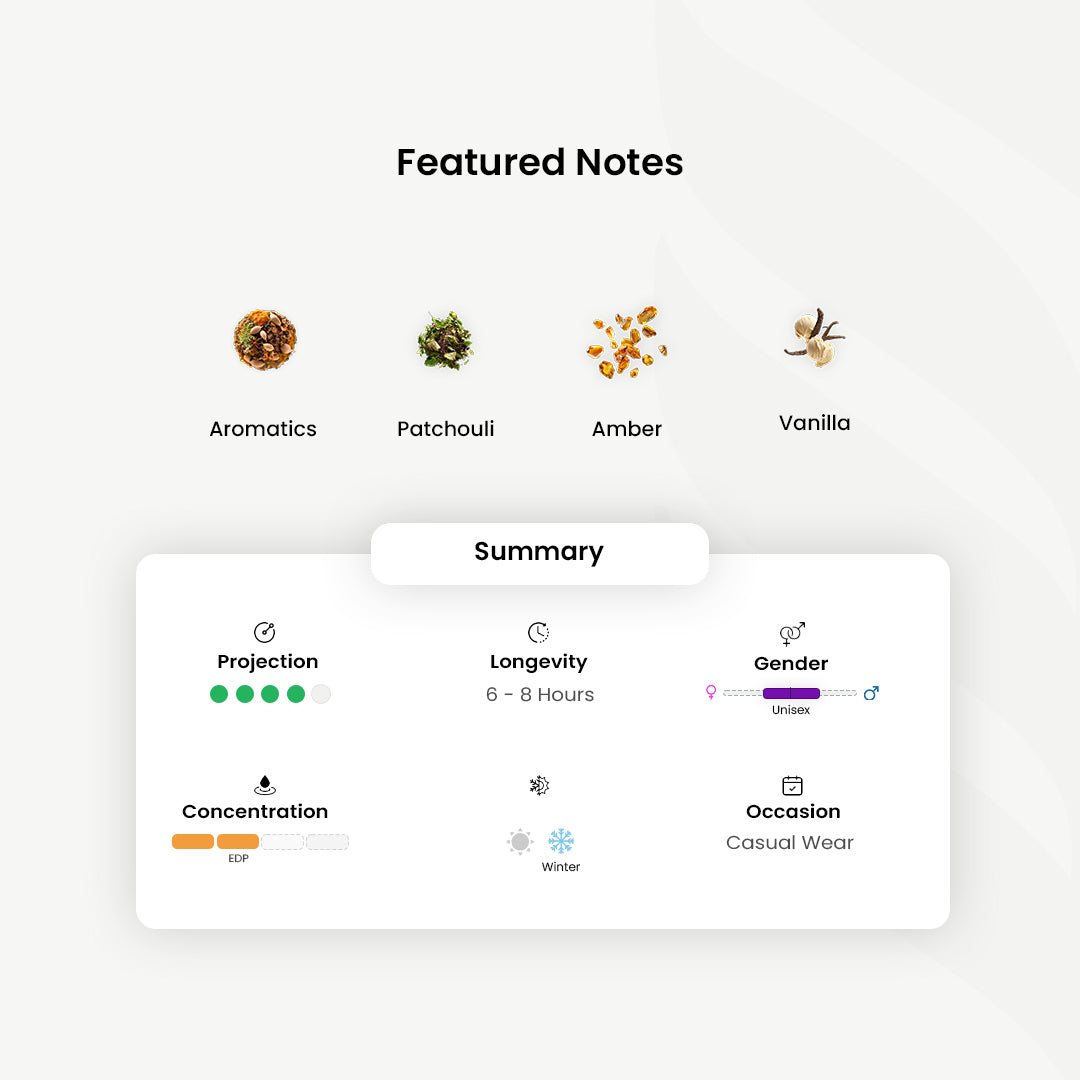 Vanilla Spice by The Fragrant Memories is a sophisticated fusion of warmth, depth, and elegance. It opens with aromatic notes that subtly awaken the senses, setting the stage for a smooth transition into a heart of soft florals and creamy woods. Cashmere wood, earthy patchouli, and buttery sandalwood create a rich, enveloping core that feels both grounding and comforting.