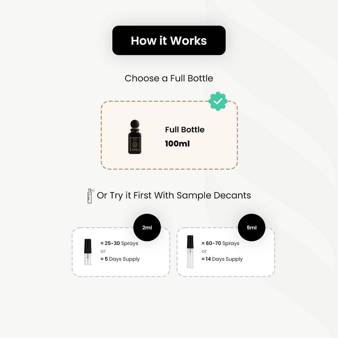 We only offer 100% authentic fragrances provided to us by our trusted distributor directly from Dubai. We never carry fakes, knock-offs, or imitations, and we take this extremely seriously. Each and every bottle is inspected and tested before we start decanting.